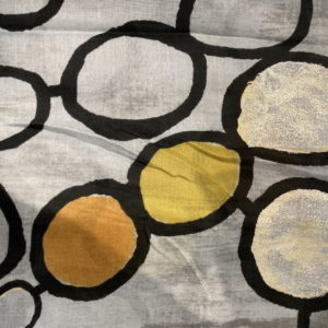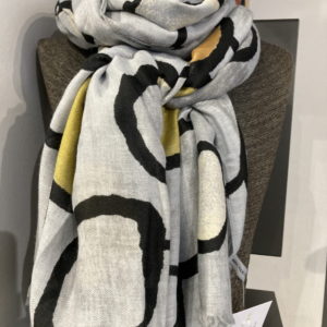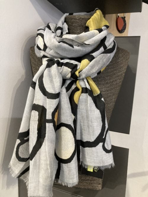Our striking print scarf with bold black circle design in mustard grey black and matt gold.