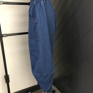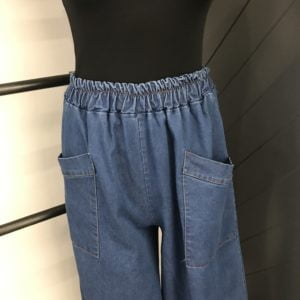 Versatile trousers in a soft denim fabric, two large funky pockets on the front. Elasticated waist band for comfort. Perfect go to trousers what ever you might be doing.